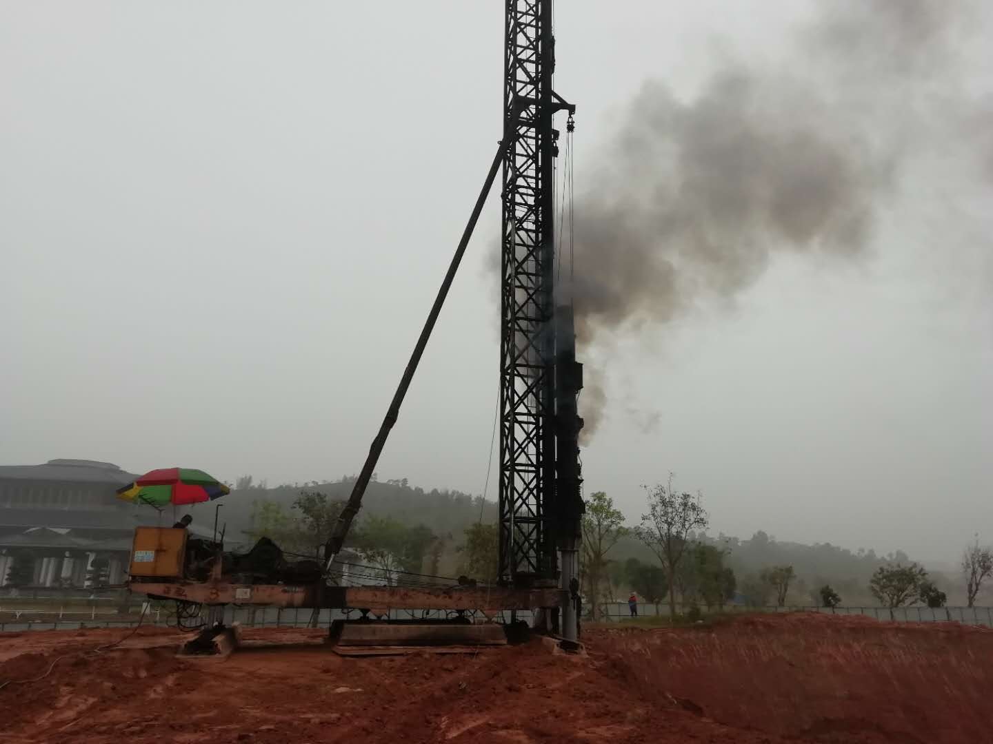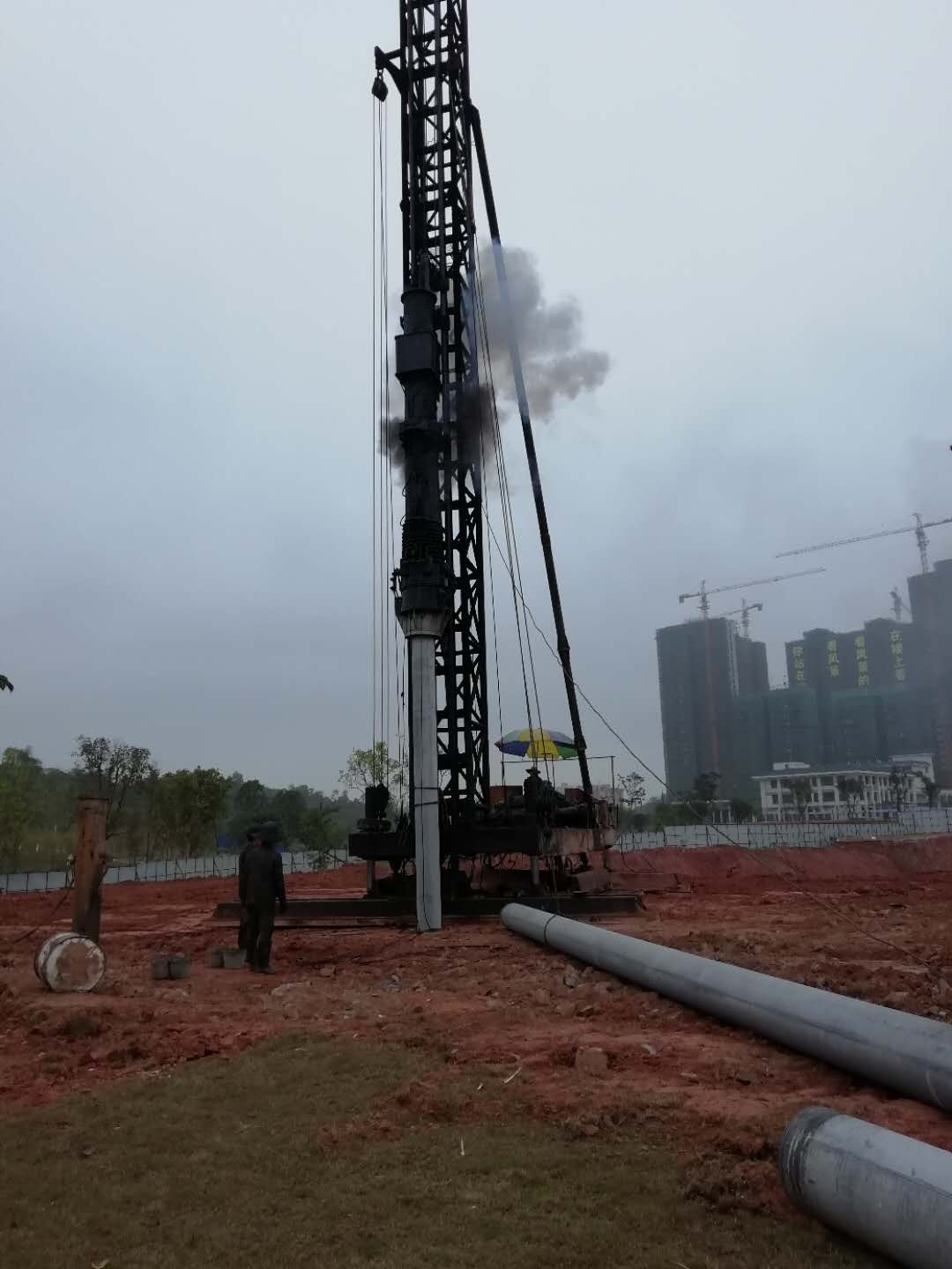 打桩的劳动强度不高,主要是危险、噪声和脏。这台老桩机烧的是柴油,在锤击时,没烧尽的柴油会随着尾气混着积碳喷出来,能喷到锤下方圆6、7米半径的地方,这些油是黑色的,粘上了衣服是没办法洗掉的。工地的老师傅也经常提醒我打的时候别离桩机太近,一来危险,二来容易报废衣服。